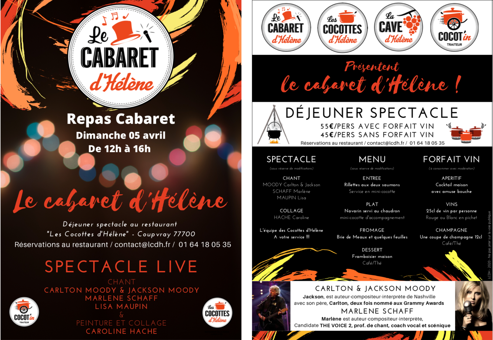 Voici les déjeuners en spectacle…le dimanche midi. Rendez vous le 05 avril à 12H00 avec la présence de :